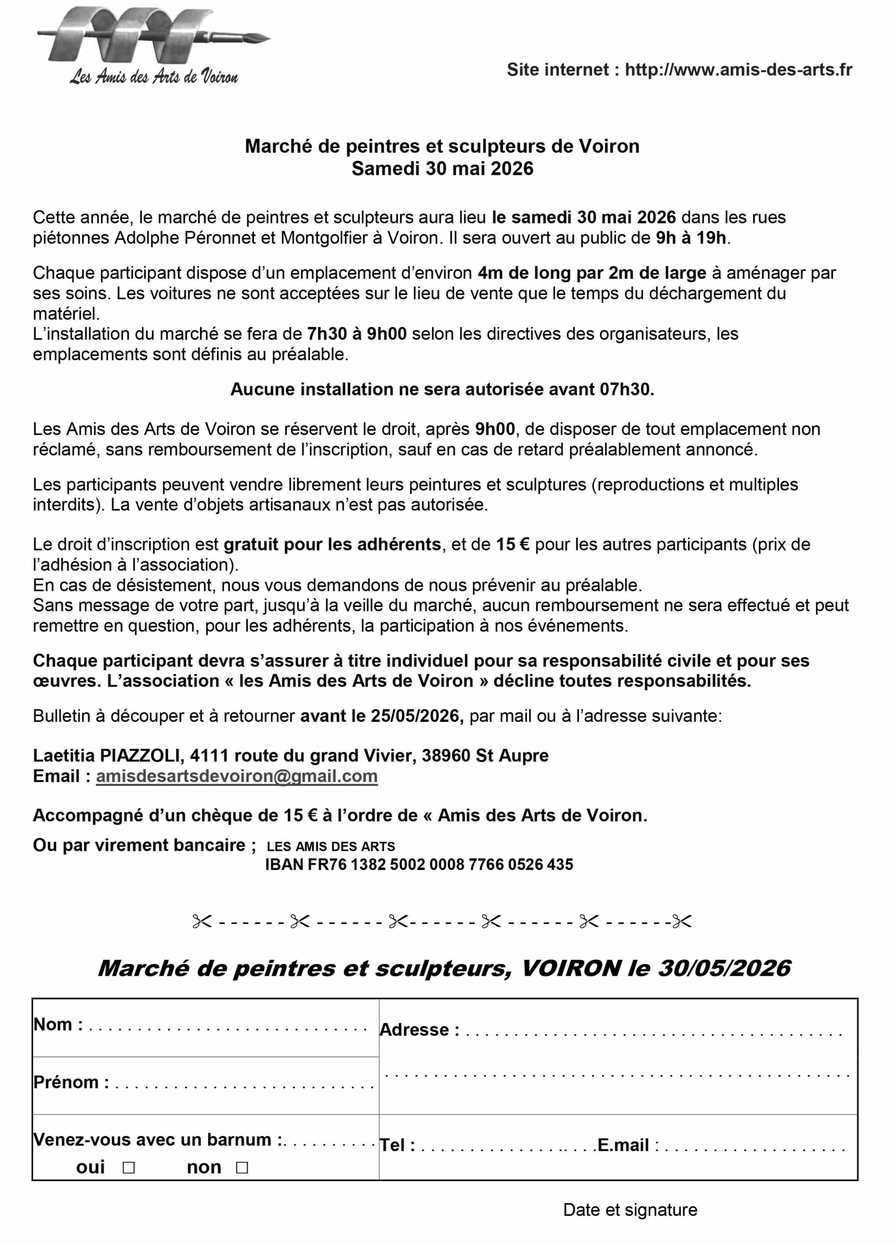Marché de peintres et sculpteurs à Voiron le 30 Mai 2026 12 mars 2026 admin Les amis des arts de Voiron organisent un marché de peintres le 30 mai.